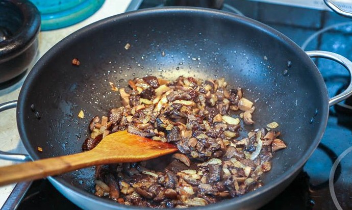 В глубокой сковороде или казане (у меня вок) пассеровать на растительном масле репчатый лук вместе с чесноком и добавить грибы. Посолить и обжаривать, помешивая, все вместе до образования корочки. Переложить грибы на тарелку.