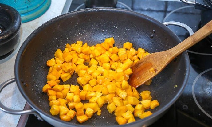 Влить в сковороду еще немного растительного масли и обжаривать до полуготовности тыкву. Посолить и поперчить по вкусу.