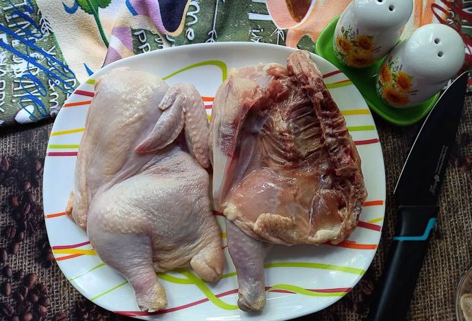 Тушку цыпленка или некрупной курицы вымыть под холодной водой, обсушить на бумажном полотенце и разрезать ножом или кулинарными ножницами вдоль спинки и грудки на две половинки. Промокнуть куриную тушку бумажными полотенцами с внутренней стороны.