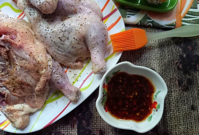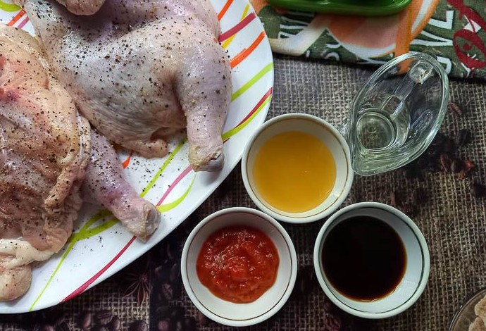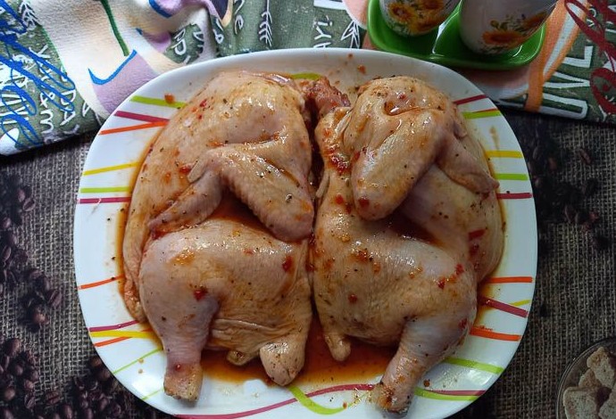 Полученным маринадом при помощи кухонной кисточки со всех сторон обильно смазать обе половинки цыпленка и уложим на тарелку кожей наружу.