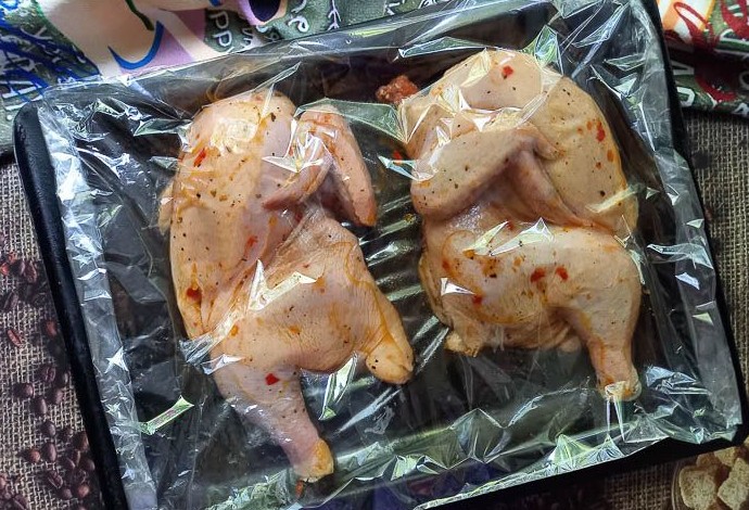 Через 30 минут упаковать части нашей миниатюрной курочки в рукав для запекания, оставив между ними небольшое расстояние, чтобы каждая половинка хорошо пропекалась со всех сторон. Уложить пакет с курятиной на противень и отправить в духовку, прогретую до 200-210C.