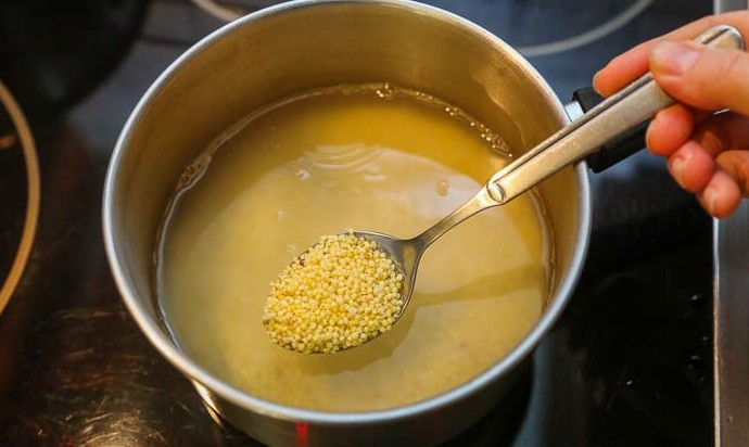 Подготовить пшено. Крупу обязательно надо залить кипятком, промыть, слить воду и снова залить горячей водой. Оставить на минутку и слить. Теперь пшенка готова к варке. И точно не будет горчить.