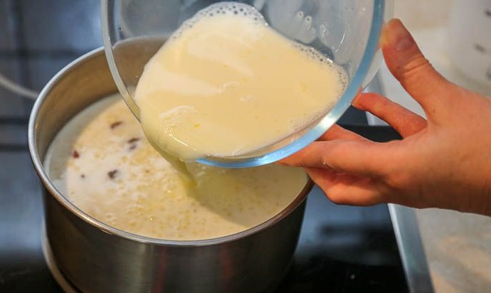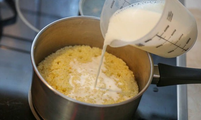 Теперь можно залить кашу молоком, но примерно 100 мл отлить в отдельную миску. Оно понадобится, чтобы смешать его с яйцом. Добавить соль и сахар.