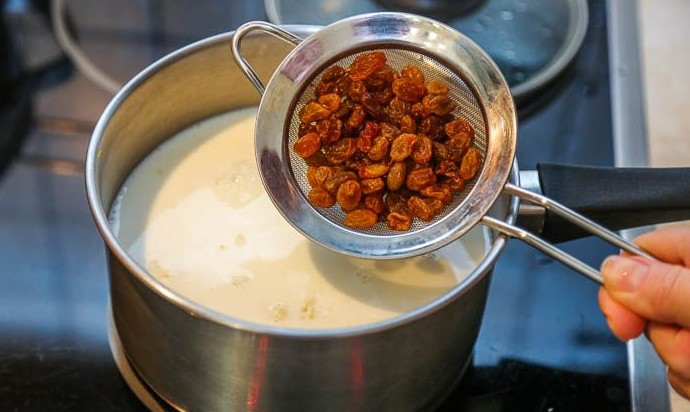 Следом засыпать в кастрюлю промытый изюм без косточек.