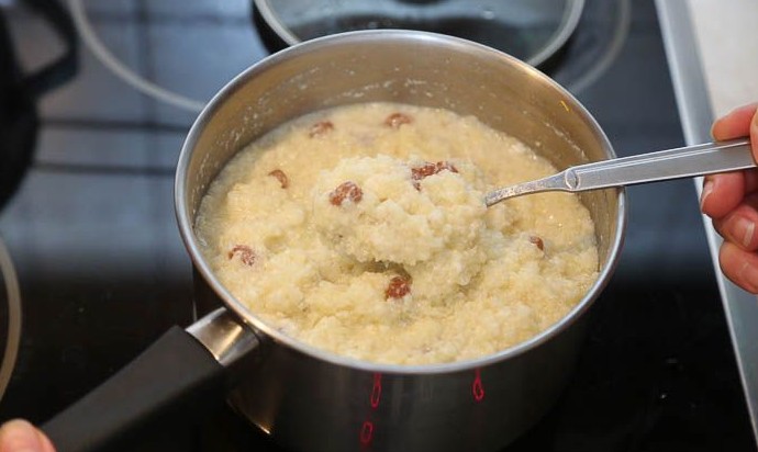 Перелить эту смесь в кашу, размешать. Как только молоко закипит, снизить нагрев до минимального и варить, время от времени помешивая, еще примерно 10-15 минут.
