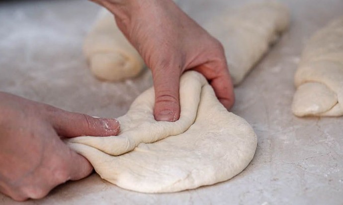 Подошедшее тесто переложить на припудренный мукой стол, разделить на 4 равные части. Куски теста растянут в прямоугольники, пару раз свернуть от края к середине, прижимая края пальцами, еще раз потянуть, чтобы получились полоски шириной около 10 см и переложить на противень, который предварительно смазать маслом и припудрить мукой.
