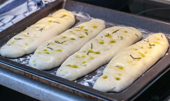 Когда тесто поднимется, щедро смазать оливковым маслом, посыпать крупной морской солью и листиками розмарина. Выпекать пиццу бьянку в прогретой до 250С духовке. Перед выпечкой поставить в духовку емкость с горячей водой. Выпекать около 10 минут, затем снизить нагрев до 220С и печь еще около 10 минут. Готовые пиццы переложить на решетку, накрыть полотенцем и дать отдохнуть. Их можно использовать для бутербродов или есть как обычный хлеб.