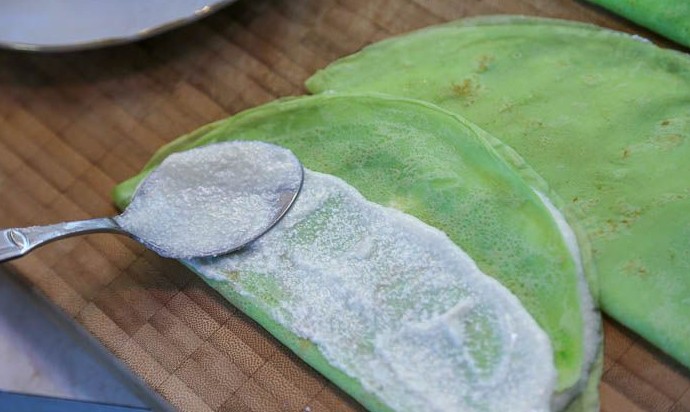 Дальше будем оформлять розовый блинный торт зелеными блинами, имитируя зеленые чашелистики. В центр зеленого блина выложить крем, распределить по поверхности, оставляя свободными края примерно 2 см. Сложить блин пополам. То же самое проделать еще с 2-3 зелеными блинами.