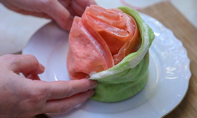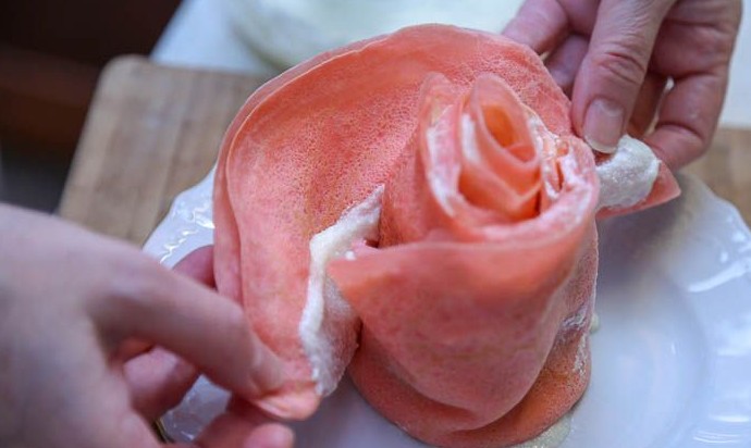 Оставшиеся 5 розовых блинчиков смазывать снизу кремом и прижимать к ценральной части блинного цветка, как показано на фото. Таким образом сформируется розовая часть блинного торта «Роза».