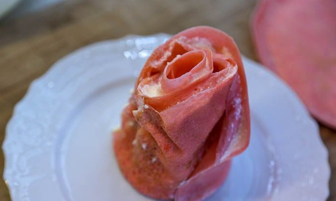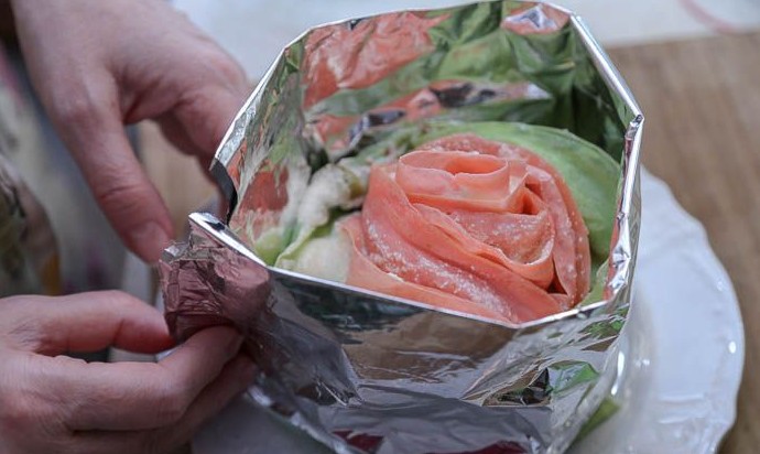 Снять с торта фольгу, немного отогнуть кончики блинов от центра, чтобы придать торту форму раскрывающегося розового бутона. Блинный торт «Роза» готов к подаче. Его легко разрезать ножом на порции, что демонстрирую на видео. Приятного аппетита!
