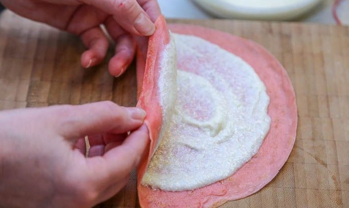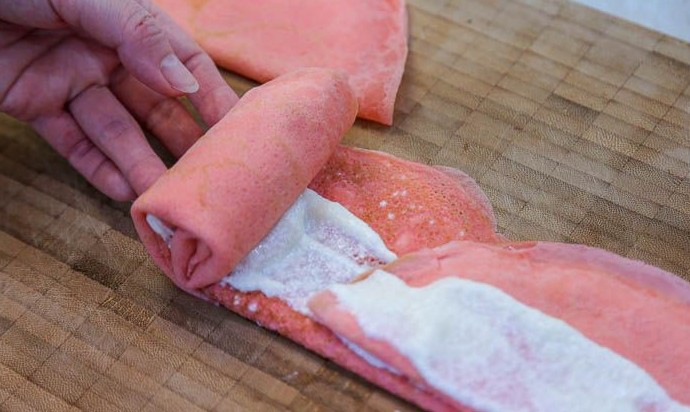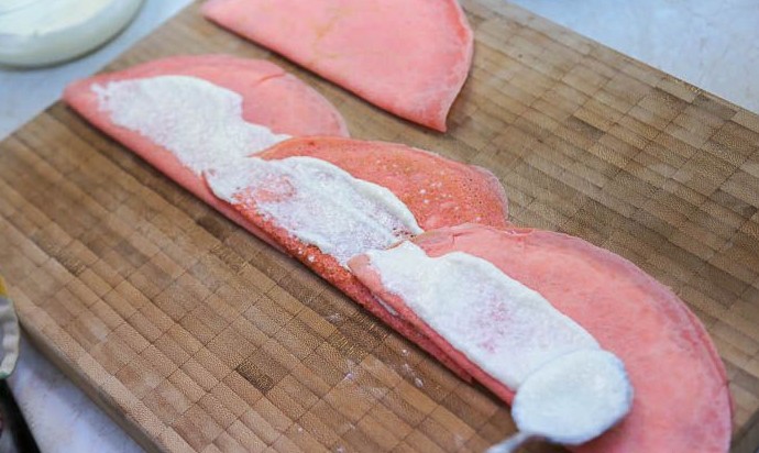 Сложить блин пополам кремом внутрь. Для формовки небольшого тортика будет достаточно 10 розовых блинов с начинкой.