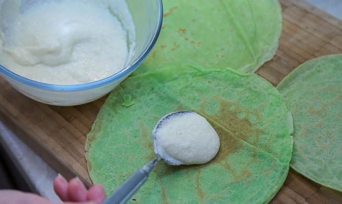 На рабочую поверхность выложить блин с начинкой, сложенный пополам, смазать его примерно наполовину снизу кремом. На этот блин внахлёст положить второй блин, так же смазать его сверху кремом и уложить внахлест третий блин. Таким образом сделать дорожку из 5 блинов, как показано на фото.
