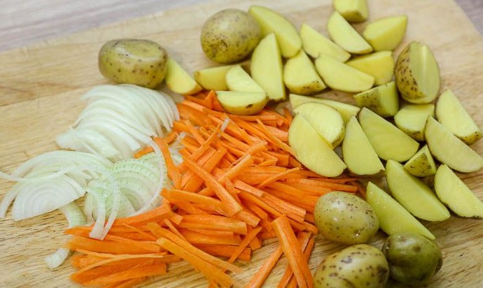 Лук очистить и нарезать полукольцами (или как вам больше нравится). Морковь очистить, нарезать соломкой или натереть на крупной терке. Мелкие клубни картофеля бэби хорошо промыть (мойте с щеточкой!),разрезать пополам или на четвертинки.