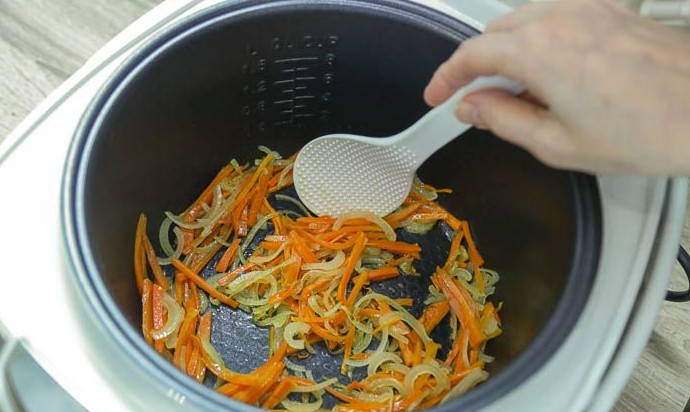 Лук с морковью отправить в мультиварку, обжаривать в течение 3-4 минут, периодически помешивая, на программе «Жарка». Крышку можно не закрывать.