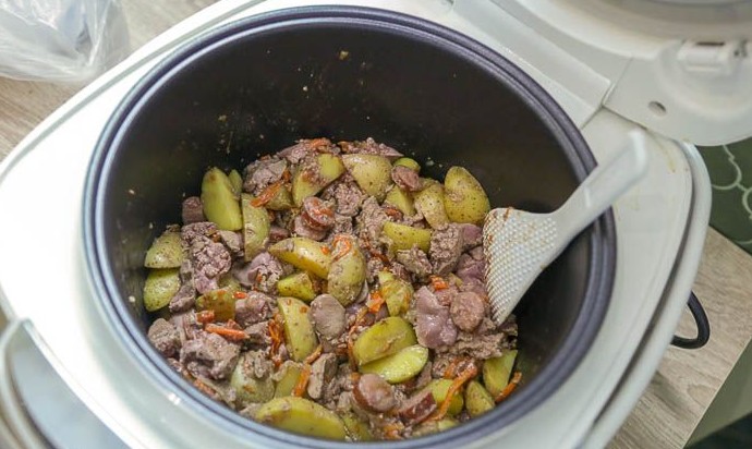Теперь можно добавить картофель и куриную печень. Посолить, поперчить и перемешать. Закрыть мультиварку крышкой и готовить 3 минуты.