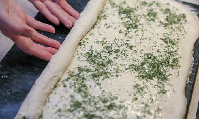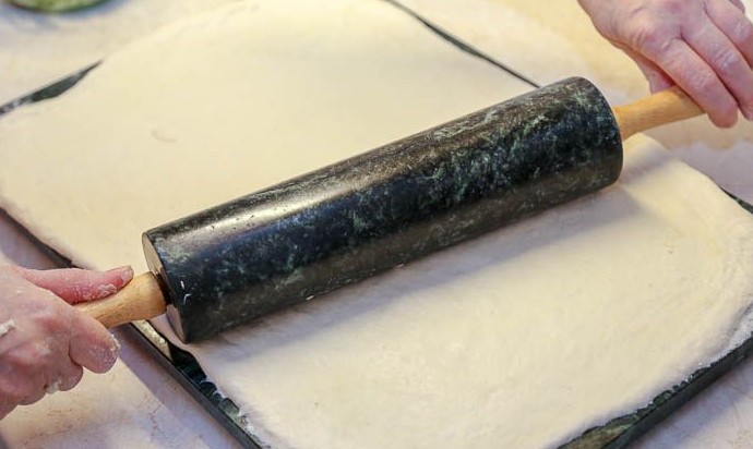 Растянуть руками и раскатать скалкой в прямоугольный пласт размером примерно 30х40 см и толщиной около 1 см.