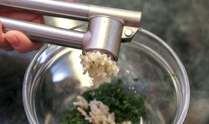 Приготовить прослойку для хлеба, смешав в небольшой миске мелко нарезанный укроп с пропущенным через пресс чесноком и растительным маслом.