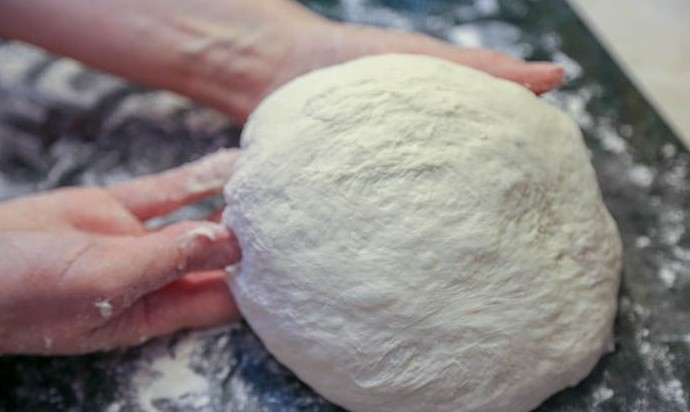 Подошедшее тесто переложить на припудренную мукой рабочую поверхность.
