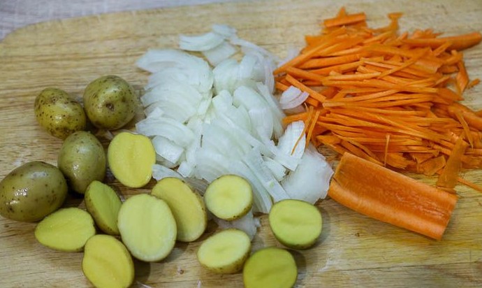 Лук и морковь очистить. Морковь нарезать соломкой (или натереть на крупной терке). Лук нарезать полукольцами.