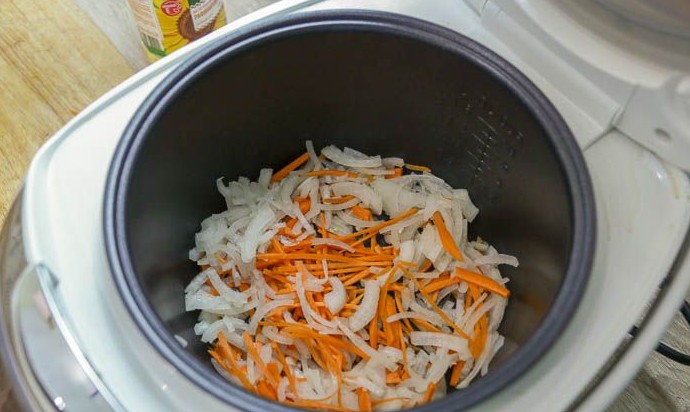 Выставить на экране мультиварки программу «Жарка». Налить 1-2 ст.л. растительного масла и добавить в чашу мультиварки лук с морковью. Обжаривать с открытой крышкой, помешивая лук с морковью лопаткой, пока овощи не начнут подрумяниваться.