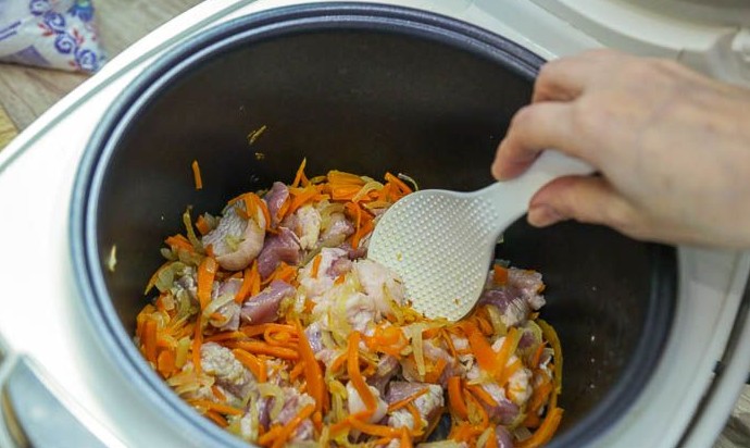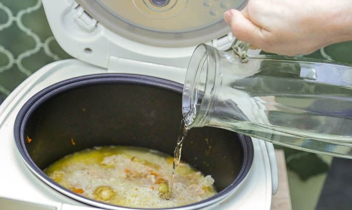 Залить содержимое чаши мультиварки горячей водой, чтобы она полностью покрывала рис с мясом и овощами (уровень воды должен быть выше примерно на 2.5 см).