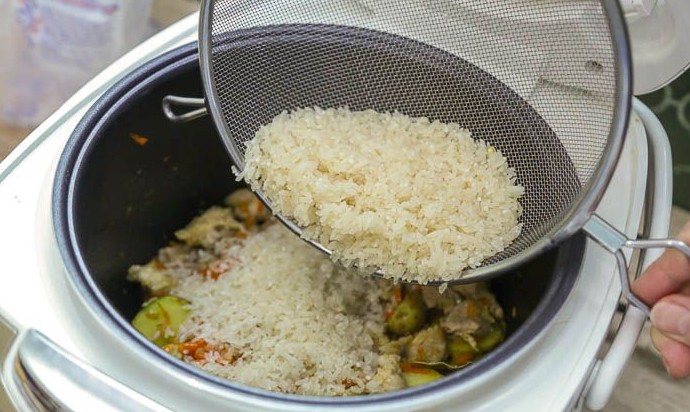 После этого можно засыпать рис, стараясь как можно равномернее распределить его по поверхности слоя из мяса и овощей.