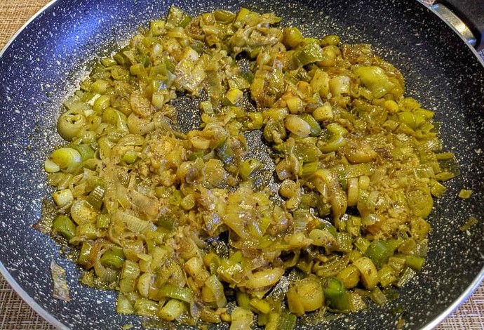 Лук мелко режем и вместе с пряностями обжариваем на растительном масле. Можете добавить куркуму, карри или хмели-сунели. В конце жарки добавляем к луку пропущенный через пресс чеснок.