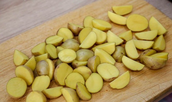 Подготовленные клубни разрезать пополам. Если попались крупные клубни, то можно разрезать на четвертинки.