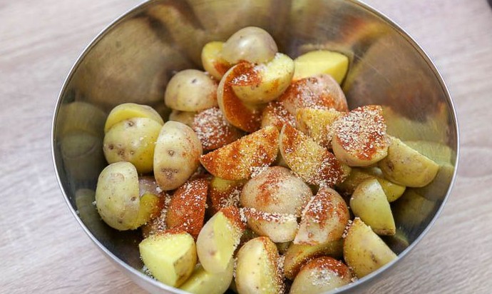 Переложить нарезанный картофель в миску, посыпать солью и специями. Хорошо перемешать.