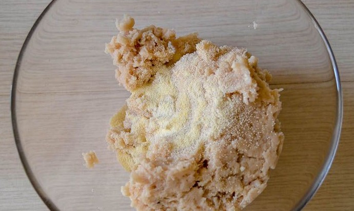 Еще раз взбейте фарш с маслом и добавьте манную крупу. Рыбный фарш с манкой перемешайте и оставьте для набухания манки минут на 15.