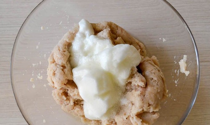 Отделенные от желтков куриные белки взбейте миксером в пену и добавьте к рыбному фаршу. Аккуратно вмешайте ложкой белки в рыбную массу. Если хотите получить более мягкое суфле, добавьте в фарш сметану (2 столовые ложки) или влейте молоко (100-150 мл).