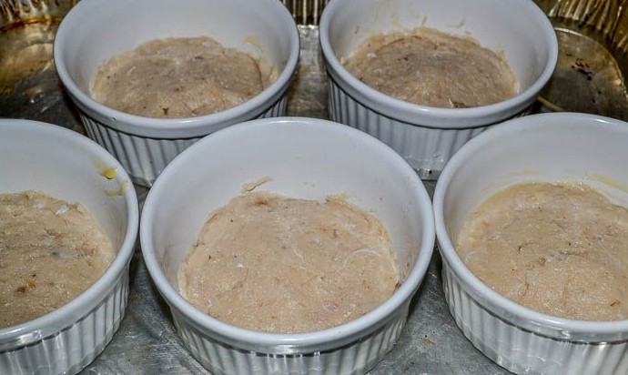 Жаропрочные формочки из керамики смажьте сливочным маслом, силиконовые формы смазывать не обязательно, и заполните фаршем. В глубокий поддон поставьте формочки с фаршем и влейте горячую воду, примерно до середины высоты формочек. Разогрейте духовку до 180С и поставьте в нее поддон с формочками. Выпекайте рыбное суфле 45-50 минут.