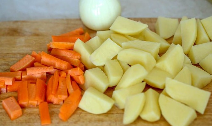 Овощи почистить и вымыть. Лук мелко порезать, чеснок раздавить широкой стороной лезвия ножа и мелко порубить. Морковь порезать соломкой, картофель - дольками.