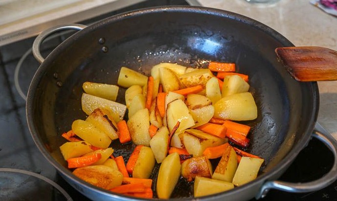 Разогреть в глубокой сковороде (или в воке) 1-2 ст.л. растительного масла, добавить морковь с картошкой и слегка обжарить, помешивая. Переложить овощи в тарелку, прикрыть фольгой, чтобы не остыли. Сковороду протереть бумажными полотенцами.