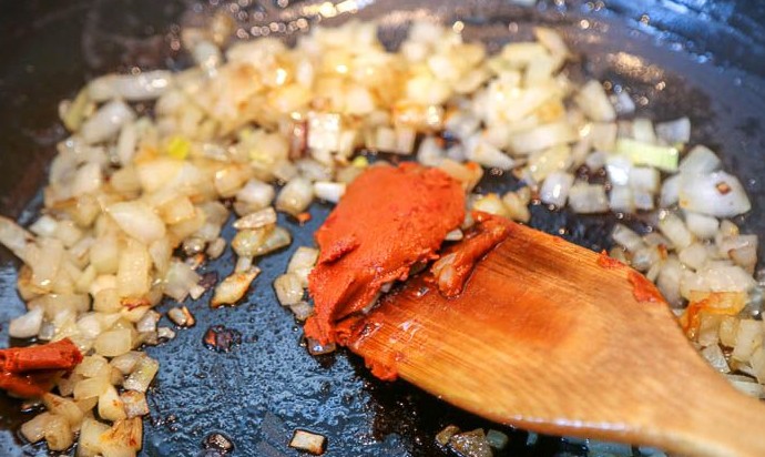 В сковороде разогреть 1-2 ст.л. растительного масла, добавить лук с чесноком и пассеровать. Прибавить острую пасту карри, перемешать с луком