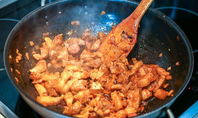Свинину (лучше с жирком) порезать маленькими кубиками.