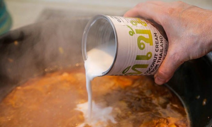 Следом добавить в сковороду кокосовое молоко (или кокосовые сливки). Размешать и довести до кипения.