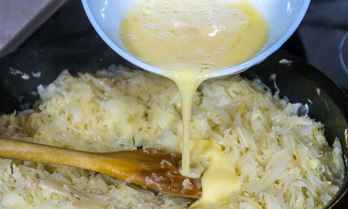 Яйцо немного взбить в миске и вылить в капусту. Быстро перемешать, чтобы яйцо равномерно смешалось с капустой.
