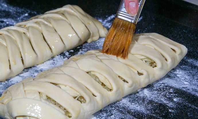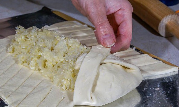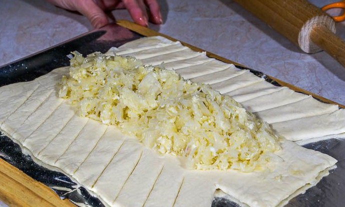 Раскатать тесто , чтобы у вас получился прямоугольник. Уложить по центру прямоугольника остывшую капустную начинку. Сверху и снизу прямоугольника оставьте свободное место (примерно 4-5- см), по бокам - по 10 см. Боковые части теста нарежьте по диагонали по отношению к начинке на полоски шириной около 1 см.