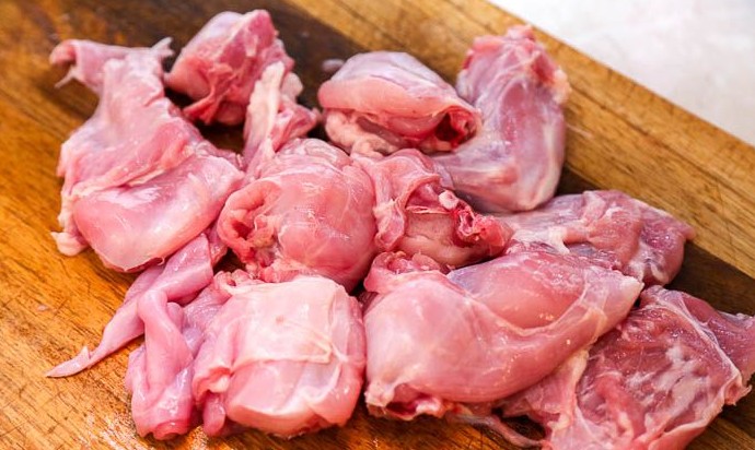 Кролика разрезать на кусочки, как описано в этом рецепте. С мяса удалить жир, порубить на более мелкие порционные кусочки. Если готовите кроличьи ножки, то каждую из них надо разрезать по суставу на 2 части. После разделки желательно залить мясо холодной водой, чуть подкисленной столовым уксусом и оставить на 1 час, чтобы убрать специфический запах.