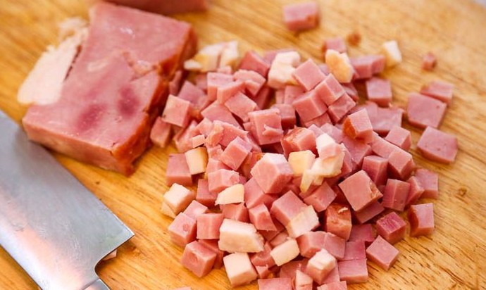 Подкопченный бекон или грудинку нарезать небольшими кубиками.