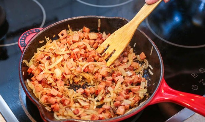 В сковороде разогреть 1-2 ст.л. растительного масла, добавить лук и пассеровать, помешивая, пока лук станет прозрачным. Добавить бекон или грудинку и продолжать обжаривать, пока мясо не подрумянится.