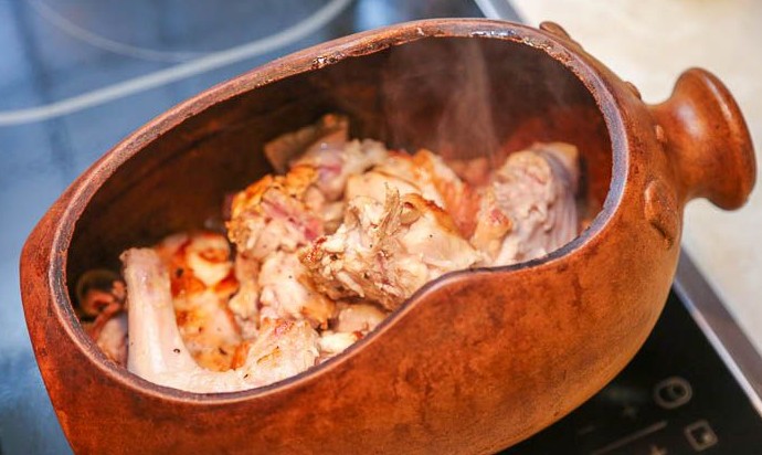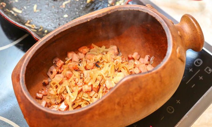 Переложить содержимое сковороды в глиняный горшок или гусятницу.