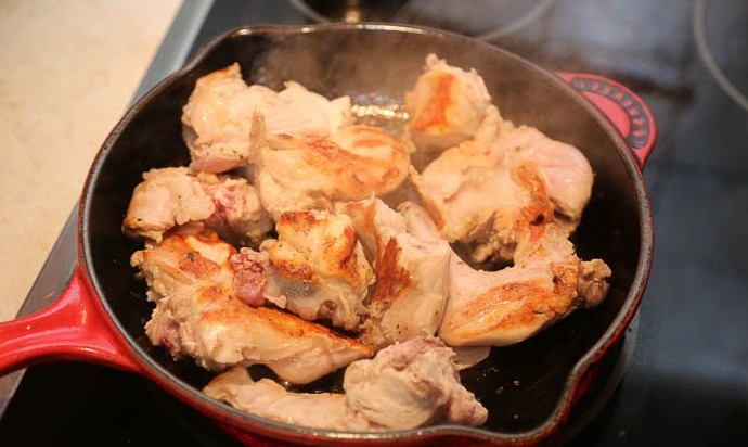 Протереть сковороду бумажным полотенцем, добавить немного растительного масла и быстро обжарить кусочки кролика. Выкладывать их в горячее масло небольшими порциями, чтобы мясо обжаривалось, а не тушилось.