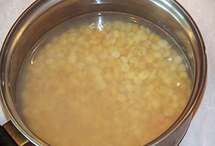 Горох хорошо промыть, залить водой и оставить в холодном месте на несколько часов, чтобы он размок. Воды должно быть в 2 раза больше чем гороха.