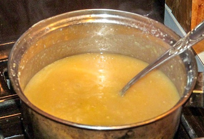 Варить горох в течение 2 часов при медленном кипении с закрытой крышкой, чтобы вода не слишком испарялась. Горох варится в несоленой воде. За два часа он разварился почти в хлам.