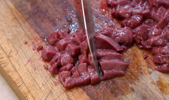 Нарезать печенку маленькими кубиками, как показано на фото. Удобнее это делать, если печенка слегка подморожена.