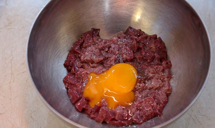 К рубленой печенке добавить соль, молотый черный перец и сушеный розмарин. Яйцо разделить на желток и белок. Сначала добавить в миску с печенкой желток и хорошо размешать.