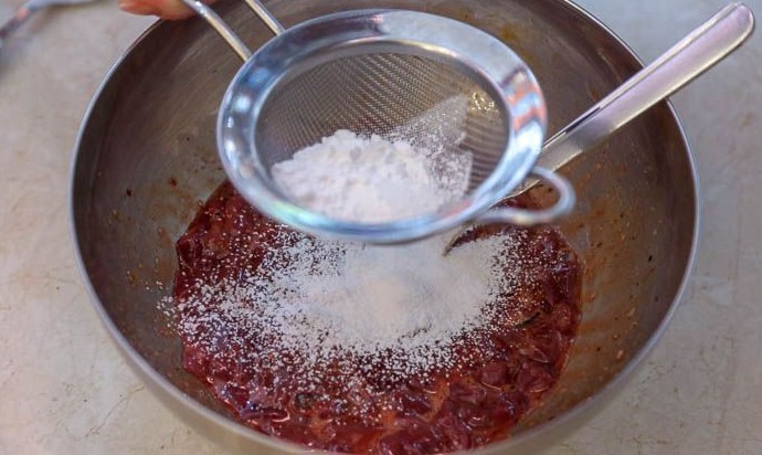 Подсыпать к печеночному фаршу крахмал или муку, размешать.