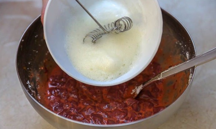 В отдельной миске взбить в мягкую пену яичный белок и примешать его к печенке. Постарайтесь делать это нежно, двигая ложкой снизу вверх, чтобы белки не осели полностью.